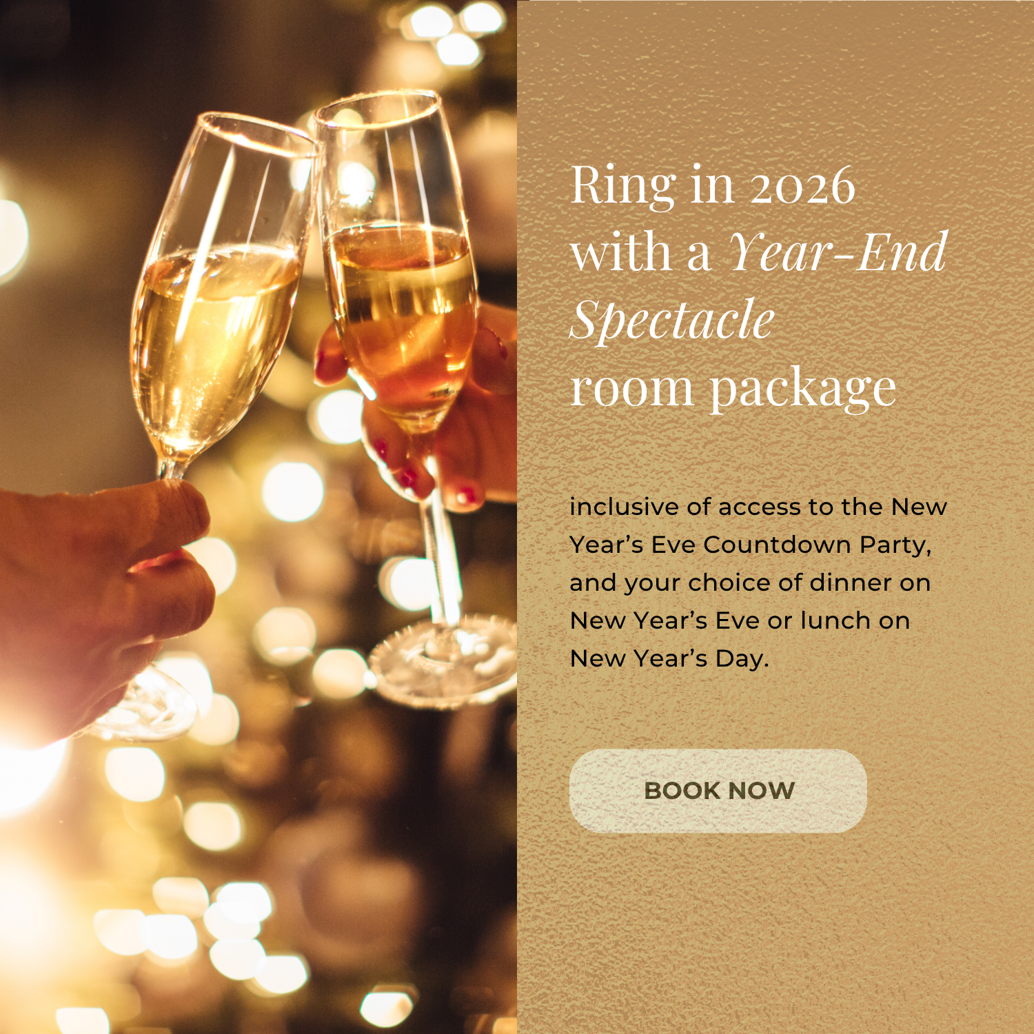 New Year’s Eve room package, inclusive of access to the New Year’s Eve Countdown Party, and your choice of dinner on New Year’s Eve or lunch on New Year’s Day