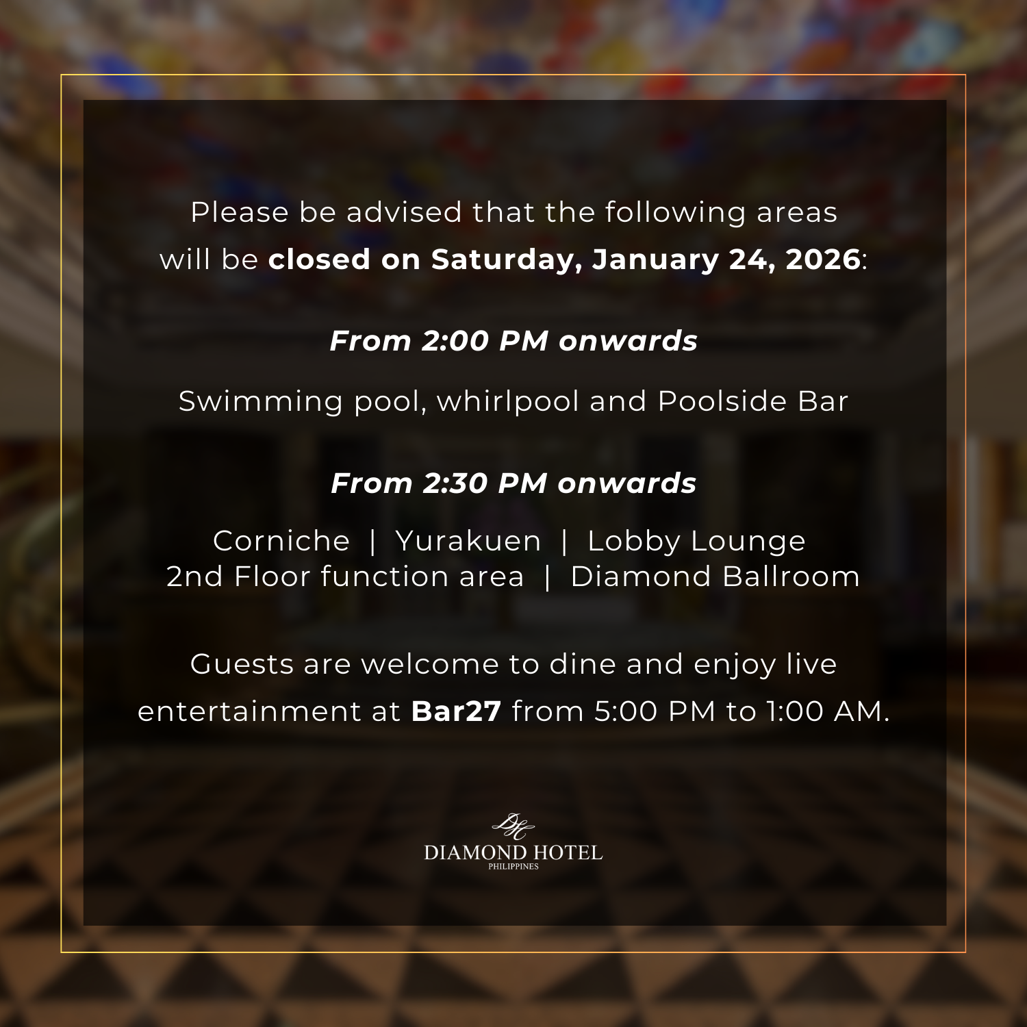 Diamond Hotel's executive floor - the Diamond Club, is designed to suit the busy executive's distinguished lifestyle. Located at the 24th, 25th and 26th Floors, Diamond Club's well-appointed...